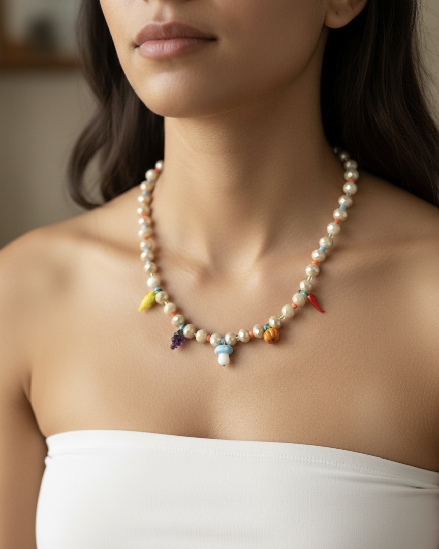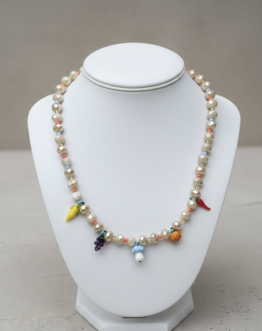 Este collar está hecho a mano con hermosos cristales de Murano y pequeños dijes de vidrio llenos de color y detalle. Cada pieza tiene un encanto especial que lo hace único, combinando delicadeza y personalidad en un solo diseño. Es perfecto para quienes aman los accesorios originales, con un toque alegre y diferente. Ideal para acompañarte todos los días o darle vida a un look sencillo. ✨