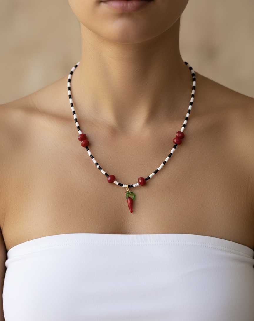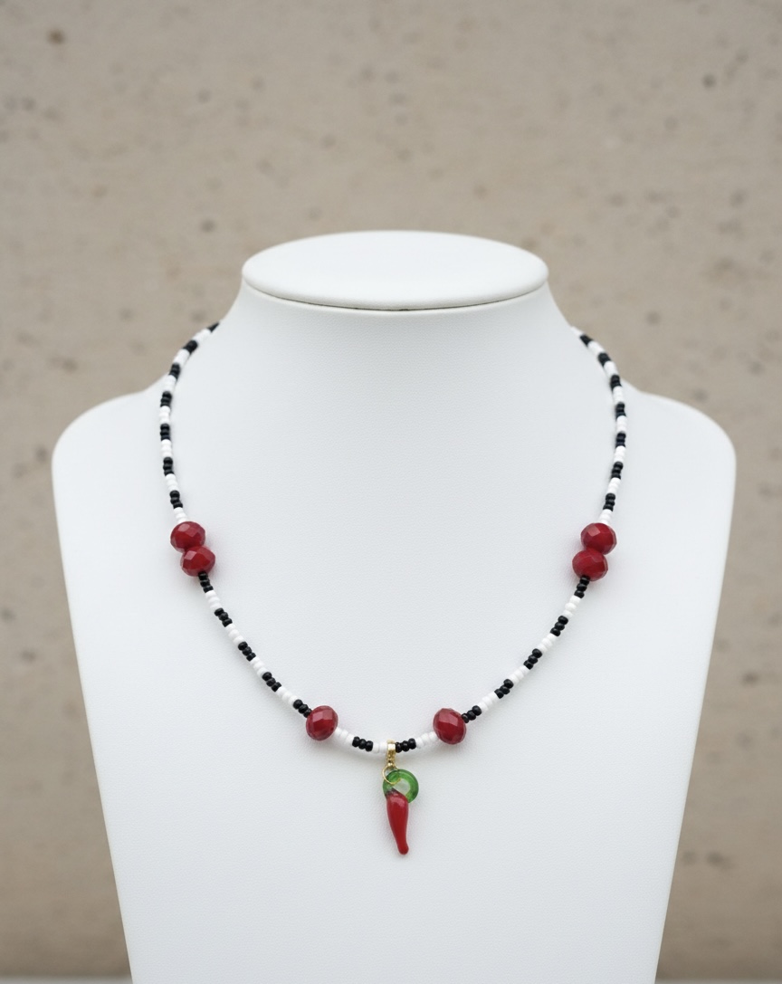 El Collar Spicy Charm es una pieza única que combina elegancia y carácter en un diseño artesanal lleno de personalidad. Este collar con dije de ají rojo simboliza energía y pasión, convirtiéndose en el accesorio perfecto para mujeres que aman destacar con estilo propio.